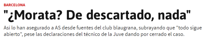 《阿斯报》表示,尽管尤文主帅阿莱格里已经表示莫拉塔将会留在球队,不过球员本人依然想要加盟巴萨,而且这个想法十分坚决。巴萨主帅哈维已经和莫拉塔通了电话,给予了他一些承诺并且希望他能够保持耐心。