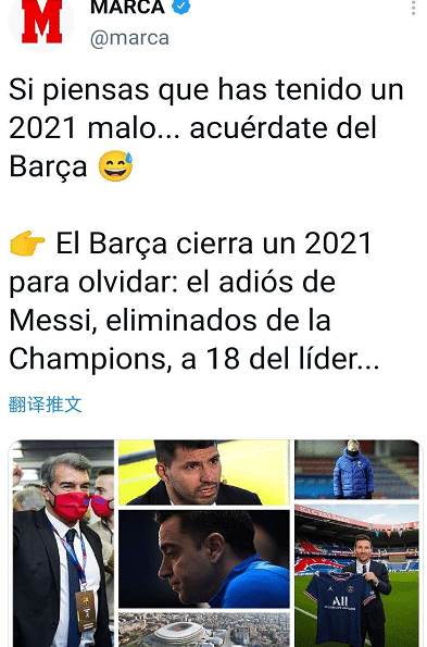 当然对于球迷们来说,2021年巴萨是动荡的,难言成功。而外媒《马卡报》的点评非常扎心:如果你觉得自己的2021过的很糟,别忘了还有巴萨。欧冠被淘汰,梅西离开,还落后领头羊18分。
