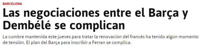 《阿斯报》表示,巴萨和登贝莱及其经纪人的会面没有收到理想结果,气氛一度十分紧张。巴萨签下费兰-托雷斯的交易,影响了登贝莱的续约。