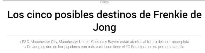 巴萨目前还没有卖德容的打算,不过出售德容可以换来大笔资金,而巴萨需要资金作为转会费。其他俱乐部也很清楚这点,目前拜仁、巴黎、曼联、曼城和切尔西在关注德容。