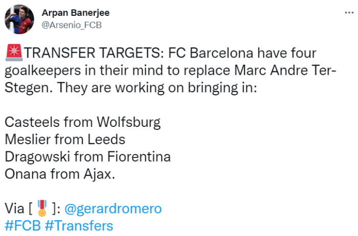 该记者表示,在巴萨的心中,以下4位门将是取代特尔施特根的合适人选,他们将针对此4人尝试进行引进。