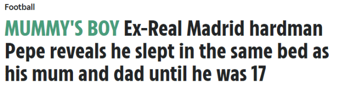 178直播12月11日讯 据英国媒体《太阳报》援引葡萄牙媒体TribunaExpresso报道,前皇马中卫佩佩在接受采访时表示,自己在17岁前都和父母在一张床睡觉。