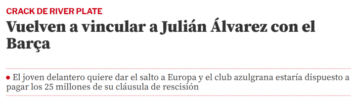 《世体》表示,补强锋线是巴萨在冬窗的首要任务,他们与河床就阿根廷00后锋线新星阿尔瓦雷斯进行了深入谈判,巴萨愿意为阿尔瓦雷斯支付2500万欧元违约金。