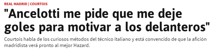 库尔图瓦说:“安切洛蒂跟我聊天时我将我和一些他执教过的优秀门将相提并论,这让我感到很开心。此外还有一件有趣的事,训练的时候安切洛蒂有时会让我故意漏几个球,来给队内的前锋增加信心。”