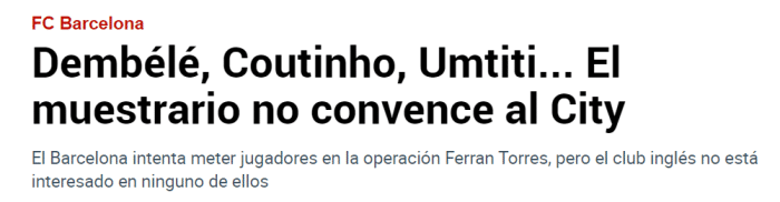 《马卡报》表示,费兰-托雷斯想要来巴萨踢球,巴萨也希望能够在冬窗将其签下,但是曼城高达7000万欧元的要价远高于巴萨方面给出的4500万欧元,这令令巴萨无法承担。