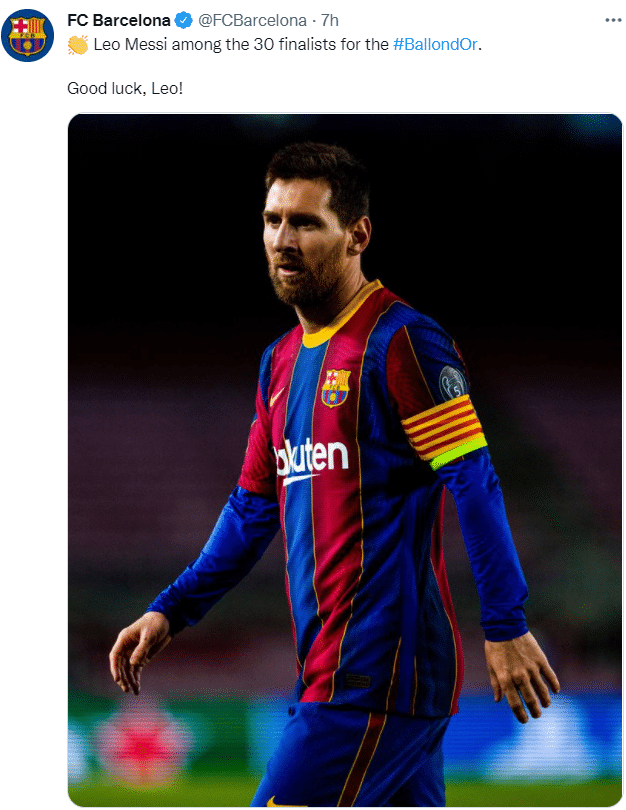 在《法国足球》公布了金球奖候选名单后,巴萨官推发文写道:“梅西进入了金球奖30人候选名单,祝你好运,莱奥!”