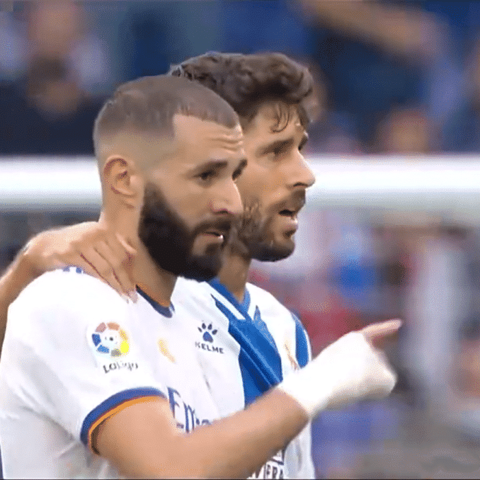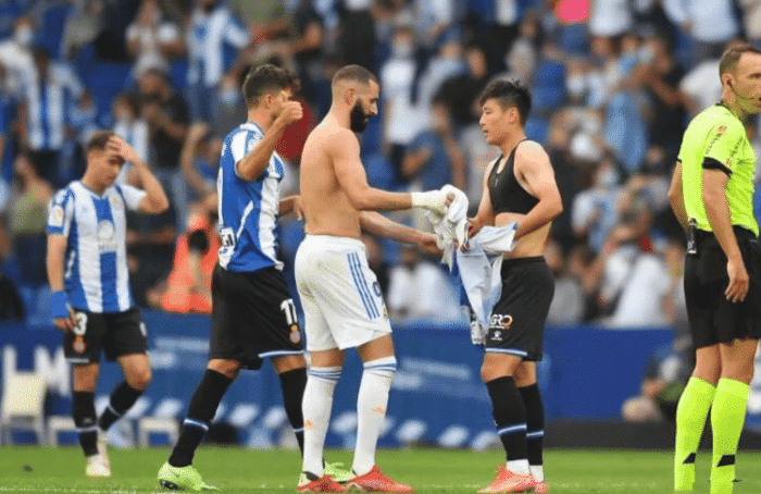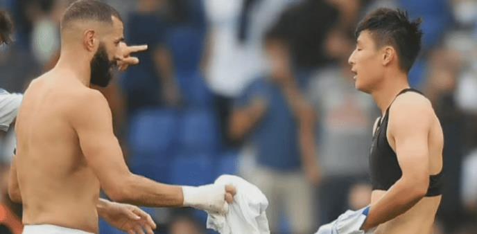 输掉比赛后,本泽马的一个举动也引发了很多球迷的热议,在比赛结束后,西班牙人球员迪达克找到了本泽马,迪达克搂住本泽马的肩膀想要交换球衣,本泽马摆手拒绝后指了指武磊,示意他要和和武磊交换球衣,随后本泽马主动来到武磊身边,完成了球衣交换。