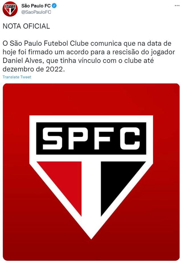 阿尔维斯在2019年加盟圣保罗,俱乐部表示双方今天已协商解约,阿尔维斯原本的合同将在2022年12月到期。