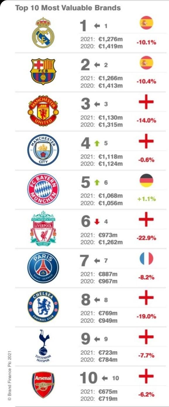 178直播讯 谁是足坛最有价值的俱乐部?当然是西甲的皇家马德里,他们是20世纪最成功的俱乐部,也是本世纪截止目前最成功的俱乐部。而近日,BrandFinance公布了2021年足坛俱乐部价值排行榜,其中皇马位居榜首,巴萨排名第二,曼联位居第三。而因为YQ的影响,大部分俱乐部的价值都有所下降,前十的俱乐部中,只有拜仁一家球队的价值上涨了。