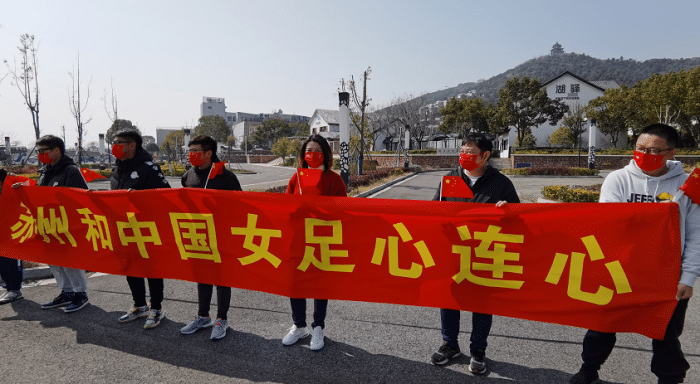 现场还拉起了横幅和标语,上面写的是“苏州和中国女足心连心”,人们高喊中国女足加油,“期待你们再回来!”