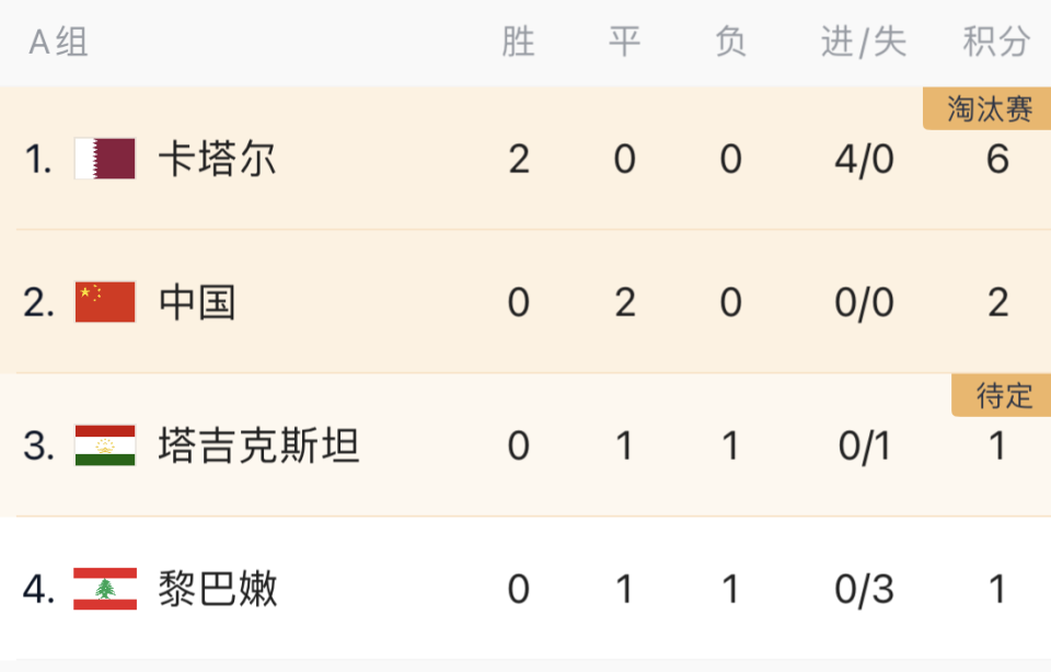 目前A组积分榜上,卡塔尔一枝独秀,2连胜积6分。中国男足2连平保持不败,积2分暂列第2。而塔吉克斯坦和黎巴嫩则都是1平1负积1分。塔吉克斯坦净胜球为-1,暂列第3,黎巴嫩为-3,暂时垫底。末轮比赛,中国男足将过招卡塔尔,而塔吉克斯坦则和黎巴嫩对垒。