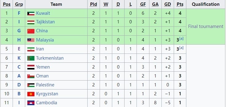 4个小组第二:科威特(F组第二)、塔吉克斯坦(I组第二)、中国(G组第二)、马来西亚(H组第二)