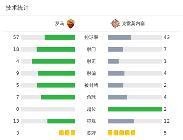 最终罗马主场2-1逆转克雷莫纳晋级8强。