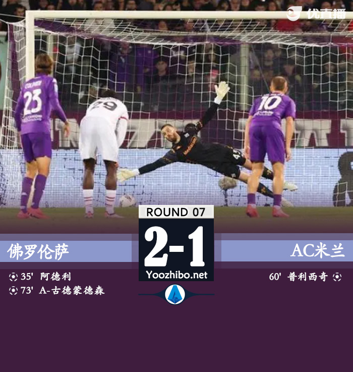 178直播讯 北京时间10月7日凌晨2时45分,意甲第7轮,米兰客场对阵佛罗伦萨。上半场,特奥犯规送点,小基恩主罚的点球被迈尼昂没收,随后阿德利破门首开纪录,米兰也获得点球机会,特奥主罚的点球被德赫亚扑出。米兰半场0-1落后佛罗伦萨。下半场,小基恩犯规送点,亚伯拉罕主罚,德赫亚再次扑出点球,随后特奥助攻普利西奇破门,古德蒙德松打进一球。最终米兰1-2不敌佛罗伦萨,终结了联赛三连胜的势头,各赛事两连败。