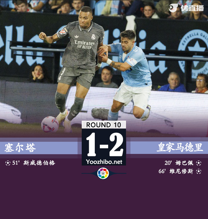178直播讯 北京时间10月20日凌晨3:00,2024-25赛季西甲联赛第10轮,皇马客战塞尔塔。上半场姆巴佩破门,皇马暂1-0塞尔塔;下半场斯维贝里为塞尔塔扳平比分,维尼修斯破门,但姆巴佩接球时越位在先,进球无效,随后维尼修斯接莫德里奇助攻单刀球打进,最终皇马2-1塞尔塔,收获两连胜,先赛一场积分追平榜首的巴萨。