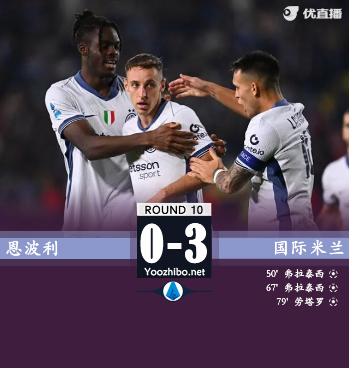 178直播讯 北京时间10月31日凌晨1时30分,2024-25赛季意甲第10轮在格罗斯计算机球场展开角逐,国际米兰客场挑战恩波利。上半场达米安进球手球无效,图拉姆造红牌,下半场弗拉泰西梅开二度,劳塔罗传射,巴雷拉和达米安送助攻。最终国际米兰客场3-0完胜十人恩波利,国米联赛5轮不败。积分榜方面,国米积21分位居第2,距榜首那不勒斯4分。