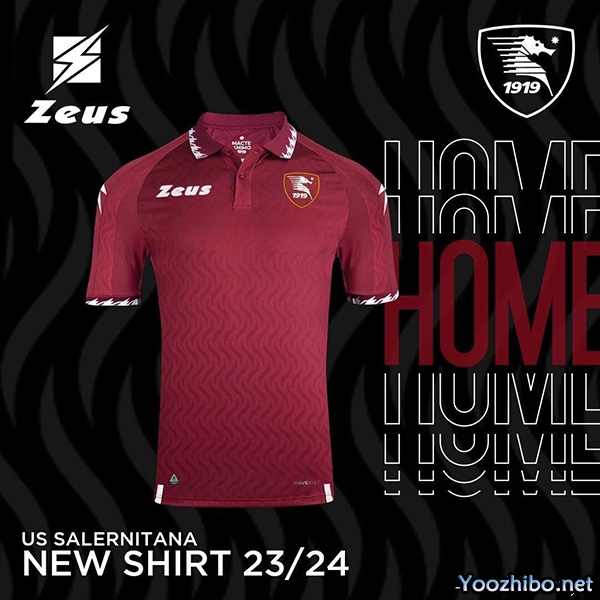 2023-24赛季萨勒尼塔纳主场球衣设计灵感源自徽章红白搭配,以红色为主色调,衣领处搭配白色条纹。