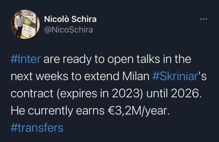 什克目前与国米的合同在2023年到期,年薪为320万欧元,俱乐部方面希望与他续约至2026年。