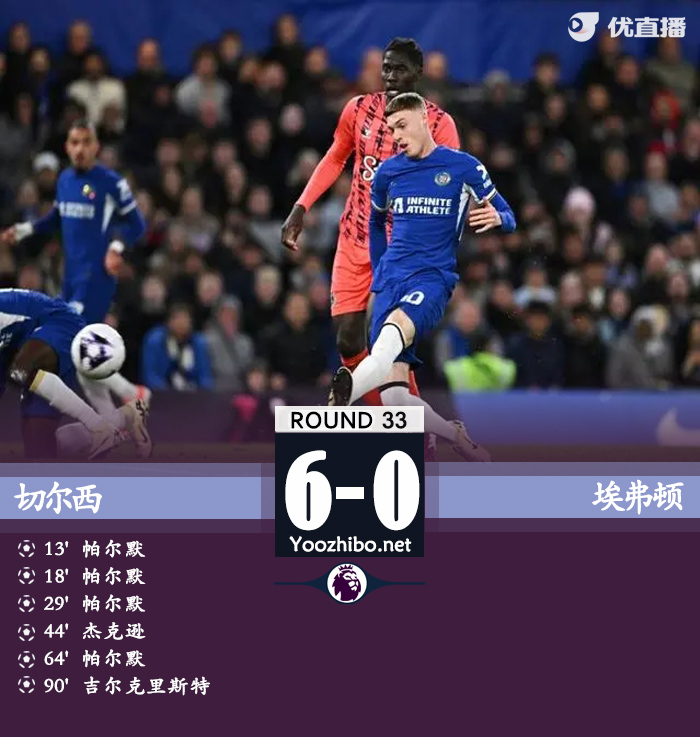 178直播讯:北京时间4月16日,英格兰足球顶级联赛第33轮,切尔西在主场迎战埃弗顿。上半场,贝托近在咫尺空门打飞,雅克松助攻帕尔默远射入网,雅克松抽射被扑后帕尔默头球补射得手梅开二度,皮克福德乌龙助攻帕尔默吊射入网上演完美帽子戏法,杜库雷头球破门被判越位进球无效,库库雷利亚助攻雅克松停球打门得手;下半场,帕尔默造点并亲自罚进完成大四喜,奇尔韦尔射门被扑后吉尔克里斯特打进一线队首球。最终切尔西以6-0大胜埃弗顿。