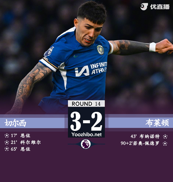 178直播讯 北京时间12月3日22点,英超第14轮,切尔西主场迎战布莱顿。上半场,巴迪亚西勒助攻恩佐破门为切尔西首开纪录,随后科尔维尔破门扩大比分优势,布纳诺特破门扳回一球,半场最后时刻,加拉格尔吃到本场个人第二张黄牌,两黄变一红被罚下,半场战罢,切尔西2-1布莱顿。下半场,穆德里克造点,恩佐点射上演梅开二度,补时阶段,若昂-佩德罗头球破门再扳一球!全场比赛结束,切尔西3-2布莱顿!