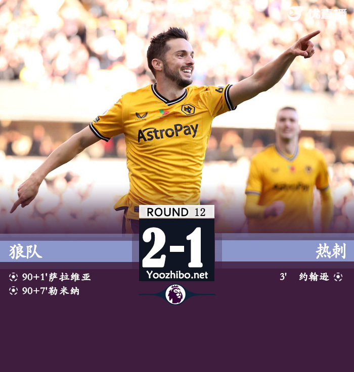 178直播讯 北京时间11月11日20:30,英超第12轮,热刺客场对阵狼队。上半场,布伦南-约翰逊3分钟闪击,这也是他的热刺首球,波罗送助攻;下半场,黄喜灿错失良机,萨拉维亚补时扳平,勒米纳完成绝杀。最终,热刺1-2不敌狼队遭遇两连败,12轮积26分位居第二位,狼队12轮15分排在第12位。