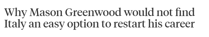 178直播讯07月05日曼联将在本月决定21岁青训前锋梅森·格林伍德的未来,他的出路不外乎三种:留在曼联,加盟英超其他球队,又或是出国踢球,后两者可能是以租借模式。然而,红魔想要出租青木到意甲,可能面对阻力,因为意大利方面并不欢迎这样涉嫌家暴的球员。