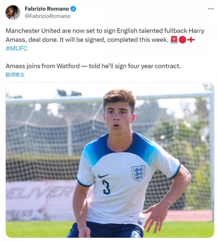 178直播讯06月27日据The Athletic报道,曼联已经同意签下沃特福德的16岁的左后卫哈里-阿马斯。