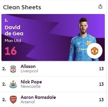 由于这4人所在的球队本赛季都只有3场比赛,因此,德赫亚已经可以以16次零封提前锁定本赛季金手套奖。而如果阿利森、波普以及拉姆斯代尔未来3场比赛有丢球,那么德赫亚将会独享本赛季英超金手套奖。这也是德赫亚时隔5年,再度获得该奖项作为英超顶级门神,德赫亚此前只在2017-18赛季获得过1次金手套奖。