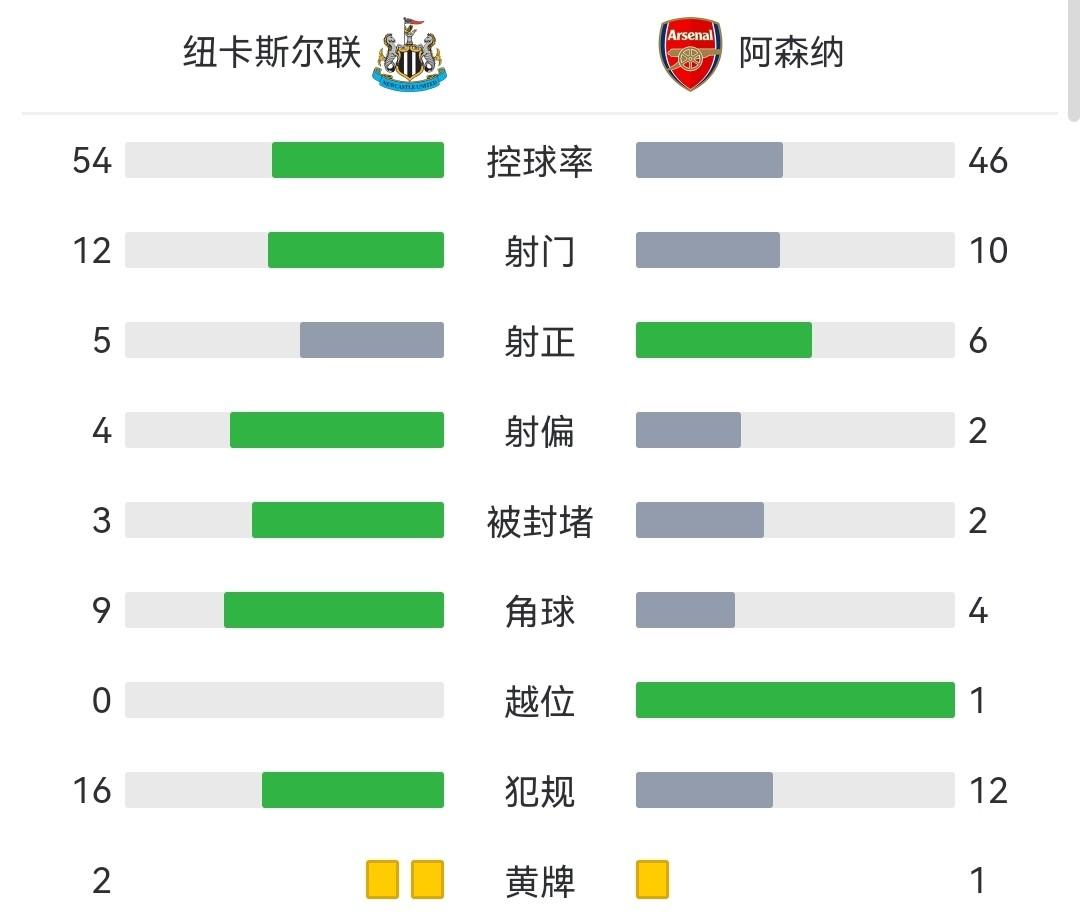最终全场比赛结束,阿森纳2-0战胜纽卡斯尔,继续紧跟曼城排名联赛第二。