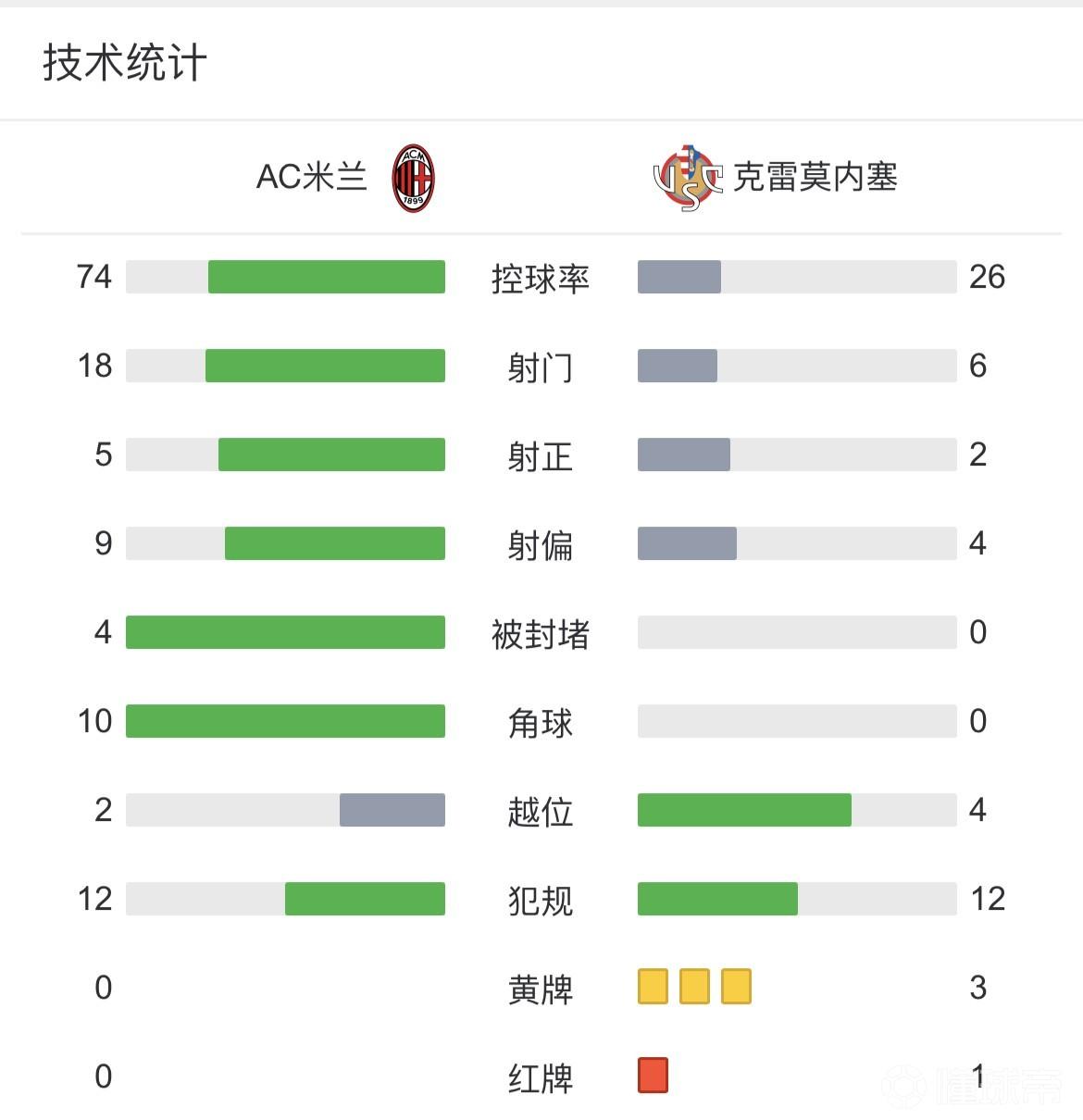 关键事件: 第76分钟,奥科雷克面对佳夫和卡卢卢的防守,扣球晃开两人后推射得手,AC米兰0-1克雷莫纳!