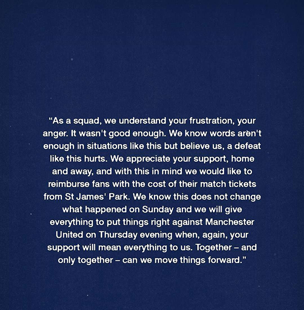 在随文附上的照片中,热刺官方写道:“作为一个团队,我们理解你们的挫折感,你们的愤怒。这不够好,我们知道在这样的情况下,言语是不够的,但相信我们,这样的失败是很痛苦的。我们感谢你们的支持,不管是在主场还是在客场,考虑到这一点,我们想向球迷报销他们在圣詹姆斯公园的比赛门票费用。我们知道这并不能改变周日发生的事情,我们将尽一切努力在周四晚上对阵曼联的比赛中纠正错误,届时,你们的支持对我们来说同样意味着一切。”