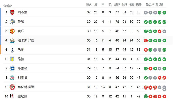 178直播讯 2022/23赛季英超联赛第32轮开打,最新积分榜出炉。阿森纳主场3-3南安普顿遭遇三连平,多赛两场的情况下榜首优势只剩下5分,丧失夺冠主动权。
