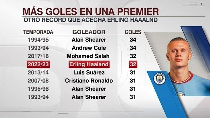 接下来,哈兰德要挑战的最重要目标,便是英超单赛季进球纪录了。英超金靴纪录是阿兰-希勒(42场34球)和安迪-科尔(40场34球)保持的34球,本赛季英超哈兰德已打入32球,曼城还剩下8场联赛。对于哈兰德而言,打这一纪录破或许只是时间问题。