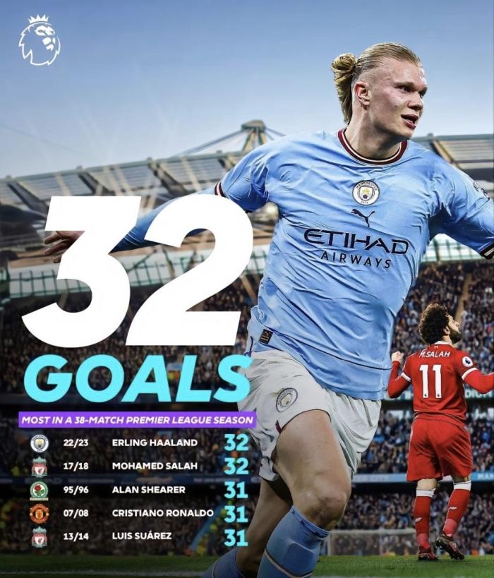 首先,哈兰德本赛季英超28场比赛已经打进32球,超越了苏亚雷斯和C罗,追平了萨拉赫在2017-18赛季创下的38轮英超单赛季进球纪录。第2,哈兰德也打破了英超处子赛季(38轮赛制)进球纪录(凯文-菲利普斯此前的纪录为30球)。