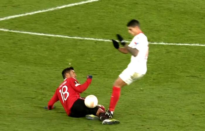至于舒梅切尔提及的,则是球迷不满的另一次争议判罚。当时塞维利亚中场拉梅拉蹬踏了倒地铲球的卡塞米罗,VAR介入后,裁判只向他出示黄牌。被踩踏的胖虎非常不幸,在被认为「粗野」的英超联赛中,他曾因为类似动作染红,没想到来到号称判罚尺度比英超更严格的欧联杯,对方这么做却没被罚下。