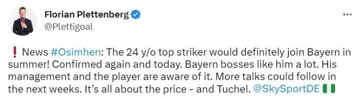 这位德国名记透露,拜仁高层非常欣赏奥斯梅恩,他的团队和球员本人都了解这一点。这位尼日利亚射手也对于回归德甲持开放态度,并且完全愿意转会拜仁,未来几周将有更多谈判进行,一切都围绕着转会价格展开,还有图赫尔这个因素。不出意外,奥斯梅恩将会成为莱万离队后,拜仁最理想的中锋替身。