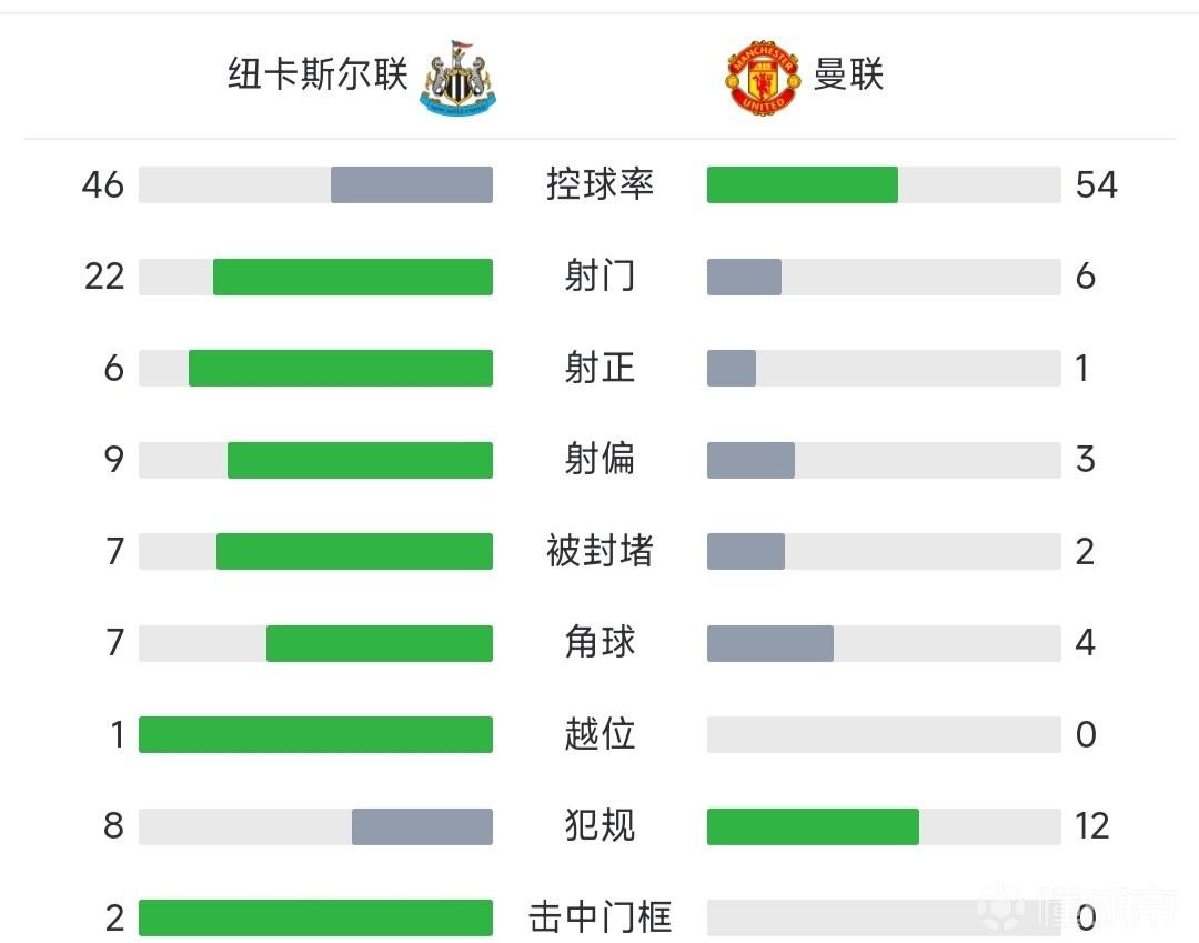 最终全场比赛结束,纽卡斯尔2-0战胜曼联。