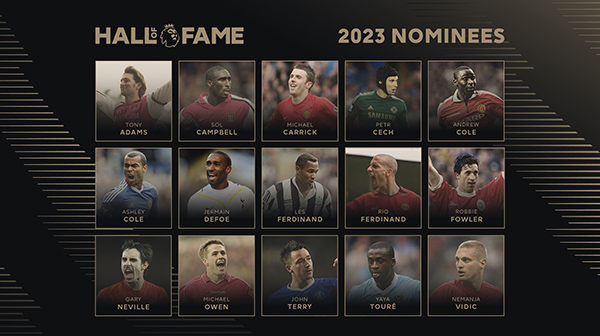 2023年名人堂的提名者包括阿森纳传奇人物托尼·亚当斯和索尔·坎贝尔,曼联的安迪·科尔、加里·内维尔、维迪奇和里奥·费迪南德,前切尔西和英格兰队长约翰·特里,以及曼城曆史上最伟大的球员之一雅雅·图雷。球迷可以于今日至4月10日到英超官网进行投票,选出三名球员进入名人堂,获胜球员将于5月3日星期三宣布。