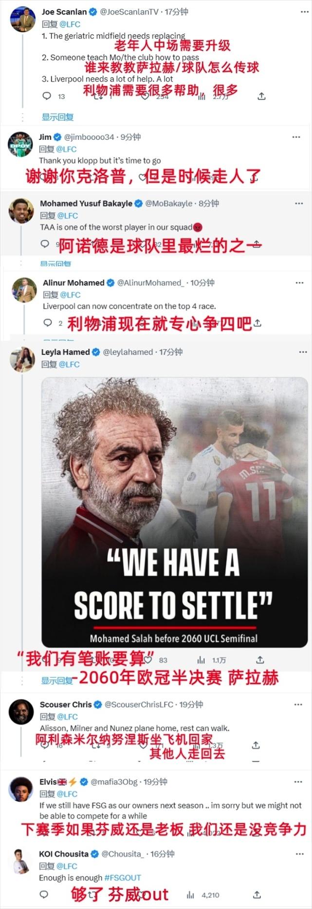 尽管赛场以前预想到球队会被淘汰,但在目睹了球队面对皇马毫无机会的90分钟之后,不少利物浦球迷赛后都彻底怒了。在俱乐部官方账号发布的赛后战报下面,大量失望的利物浦球迷,将矛头指向了芬威集团、克洛普、萨拉赫、阿诺德等人。