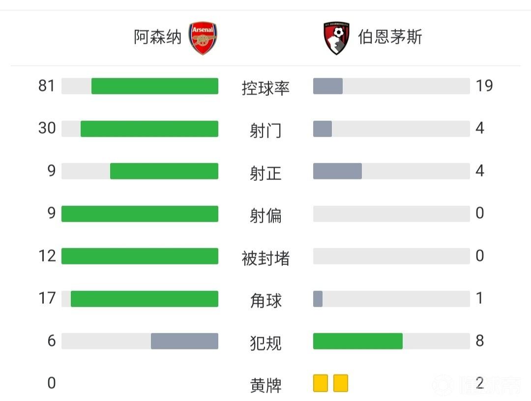全场比赛结束,阿森纳3-2伯恩茅斯。
