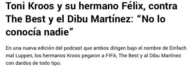 对此克罗斯兄弟都颇有微词。托尼-克罗斯直言:“在世界杯年里,世界杯对于FIFA最佳评选总是很重要的,梅西是卡塔尔世界杯上的金球奖(最佳球员),所以他当选FIFA年度最佳并不意外。”