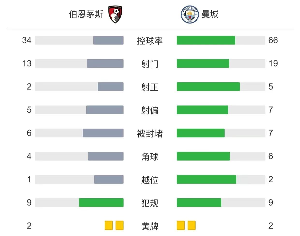 全场比赛结束,最终曼城客场4-1战胜伯恩茅斯。
