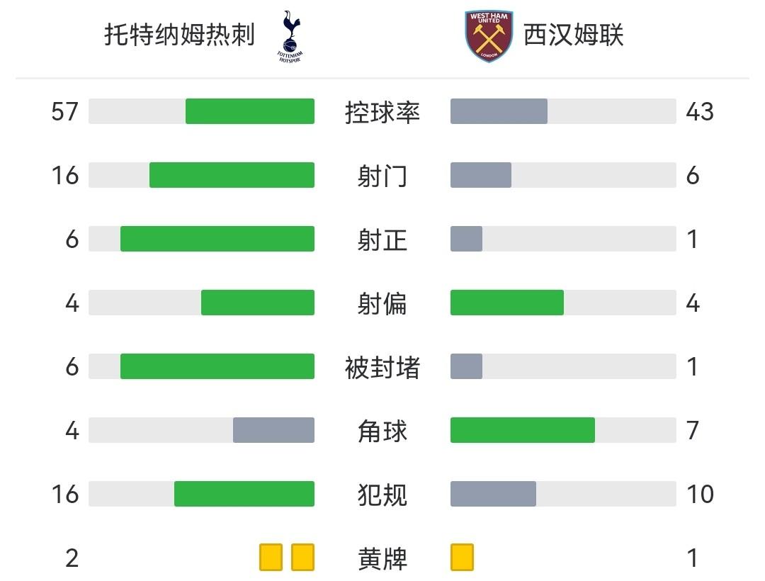 全场比赛结束,最终,热刺主场2-0击败西汉姆联。