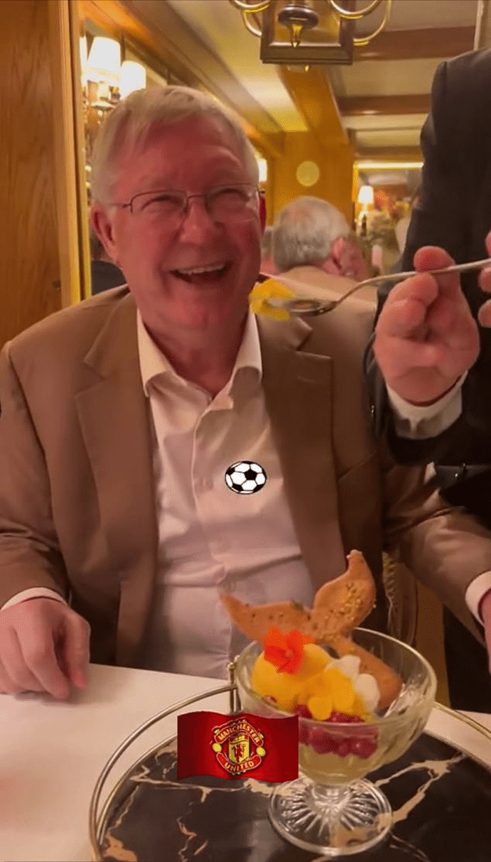 曼联可能被收购,脱离格雷泽家族的控制,让全球红魔支持者兴高采烈,其中也包括81岁的老爵爷弗格森。弗爵周中与好友大卫·吉尔和昔日弟子纳尼一起,观看了曼联做客诺坎普2-2战平巴萨的比赛,赛后他在当地餐厅吃饭,情绪非常高涨。餐厅经理耶稣·佩雷斯·阿隆索发布的一段视频显示,他亲自给弗爵喂了一勺点心。