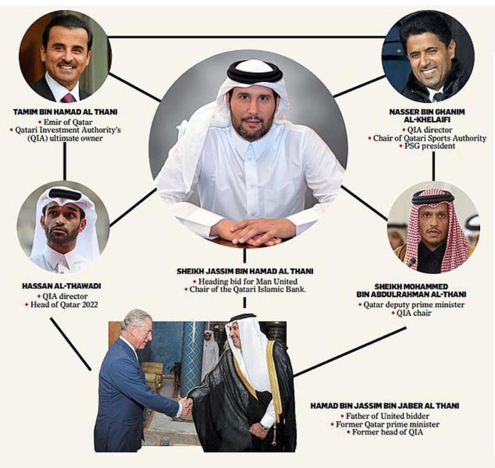 但更多人相信,谢赫·贾西姆只是卡塔尔收购曼联的形式上的领头人,这一举动源自其皇室。之所以选择这位银行家,是因为他独立于该国主权基金QIA。拥有3740亿英镑财富的QIA,即卡塔尔投资局,他们是卡塔尔体育投资基金(QSA)的母公司,后者拥有巴黎圣日耳曼70%所有权。