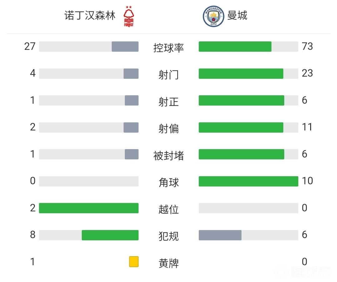 全场比赛结束,曼城客场1-1战平诺丁汉森林。