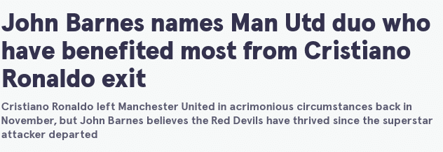 178直播讯02月14日据英国媒体《镜报》报道,利物浦名宿约翰-巴恩斯在接受采访时表示,C罗的离开对拉什福德和桑乔是有益的。