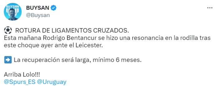 178直播02月13日据乌拉圭记者Buysan报道,本坦库尔十字韧带撕裂,将至少伤缺6个月。