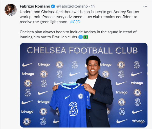 此前巴西媒体透露,安德烈-桑托斯仍然没有拿到可以为切尔西效力的工作许可。