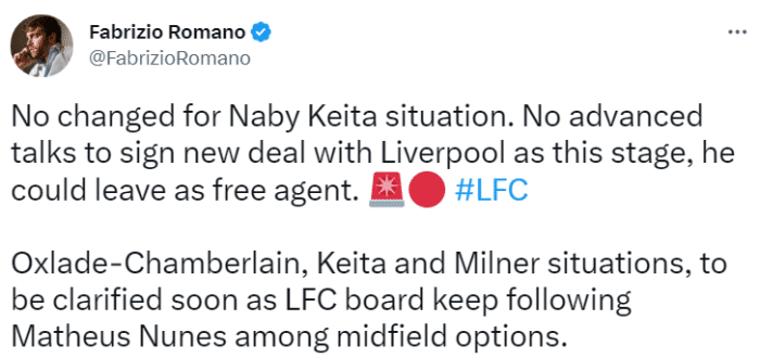 罗马诺表示,凯塔的情况没有改变,利物浦没有与他进行续约的谈判,这代表着他可能会在夏窗自由身离队。